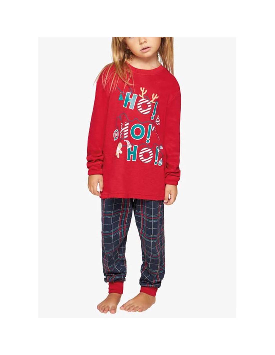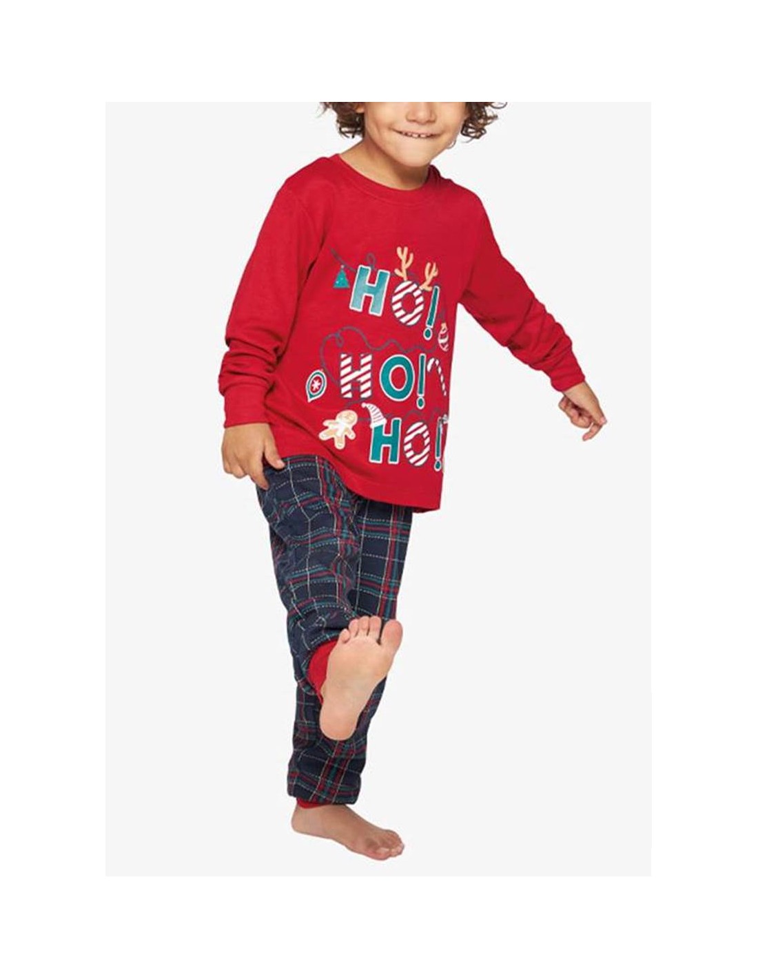 - Camiseta de manga larga confeccionada en tejido de algodón, de color rojo intenso, con un diseño navideño “HO, HO, HO” estampado en el centro, que aporta un toque alegre y festivo.