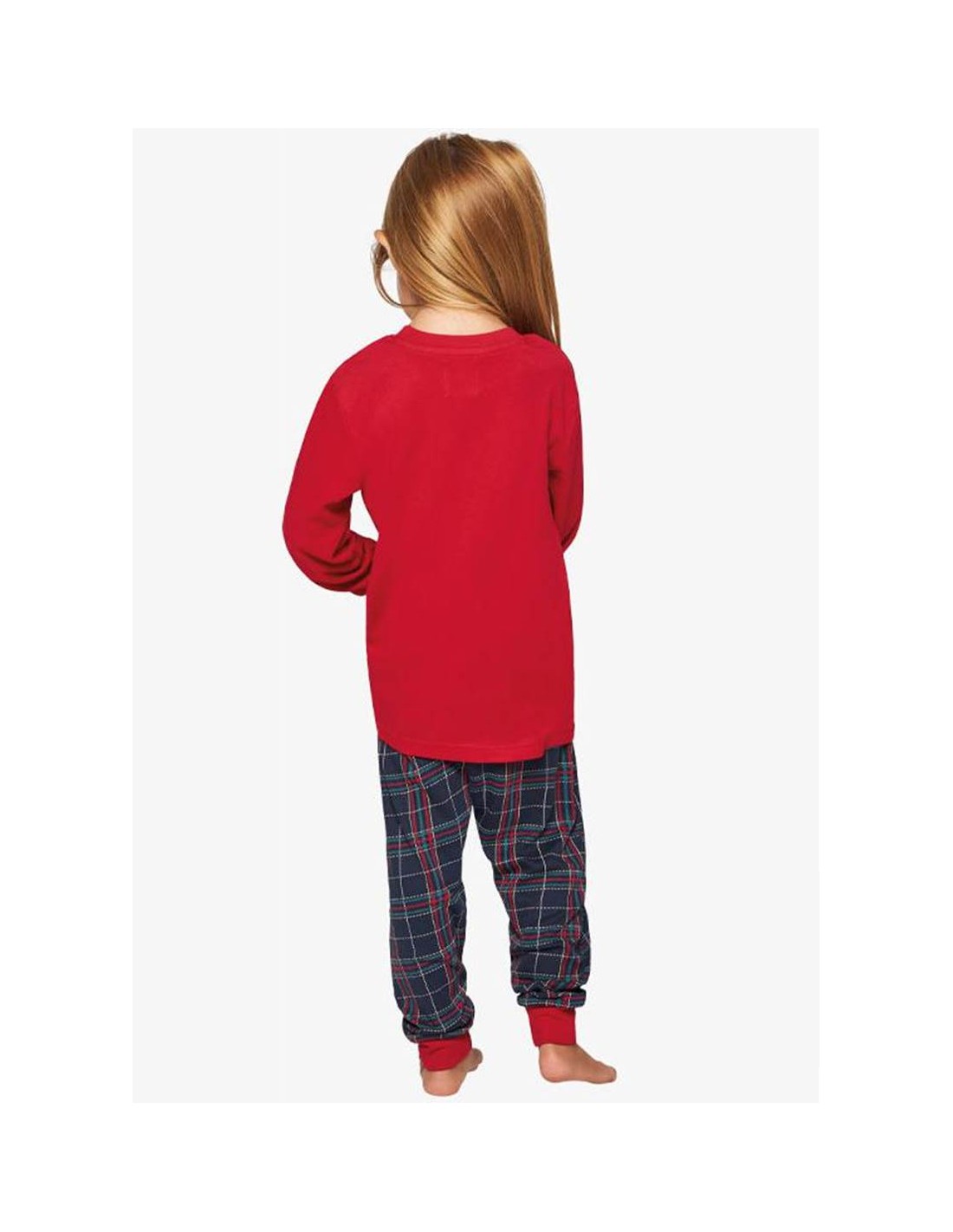 - Pantalón largo del mismo tejido, con un estampado de cuadros en tonos rojos y verdes, que combina a la perfección con la camiseta.
