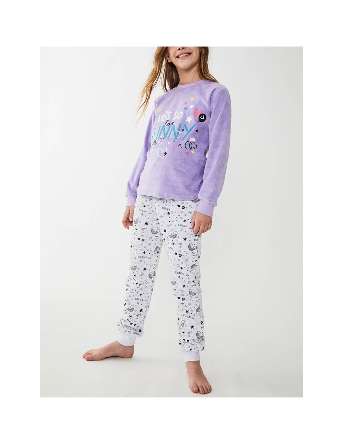 Pijama Largo Tundosado de la marca Tobogán. Pijama confeccionado en tejido de algodón tundosado con camiseta de cuello redondo de color lila con dibujo estampado en la zona central y puños. Pantalón en color gris con dibujos estampados, cinturilla elástica con cordón ajustable y puños en los tobillos.