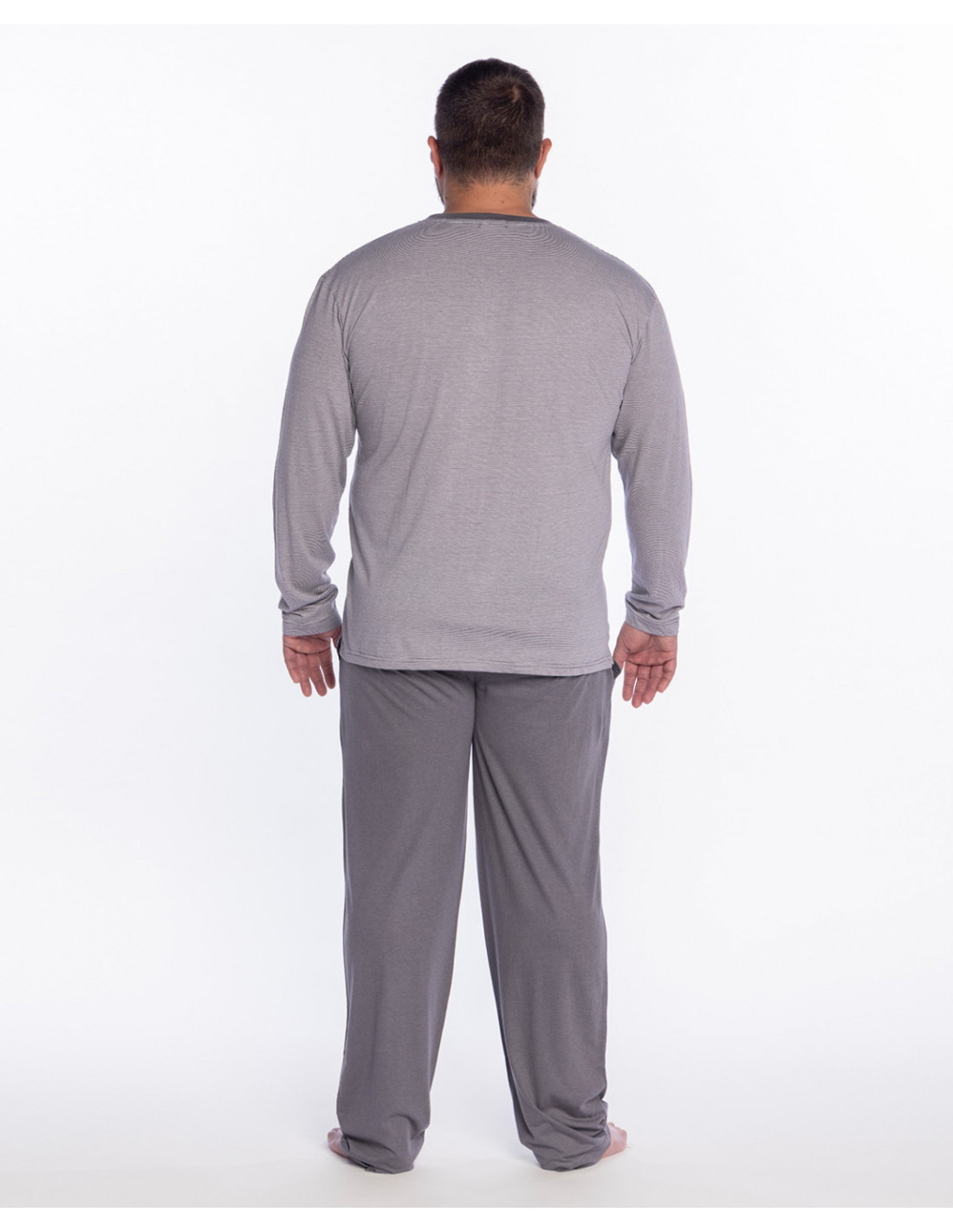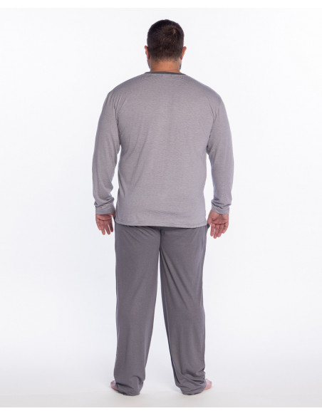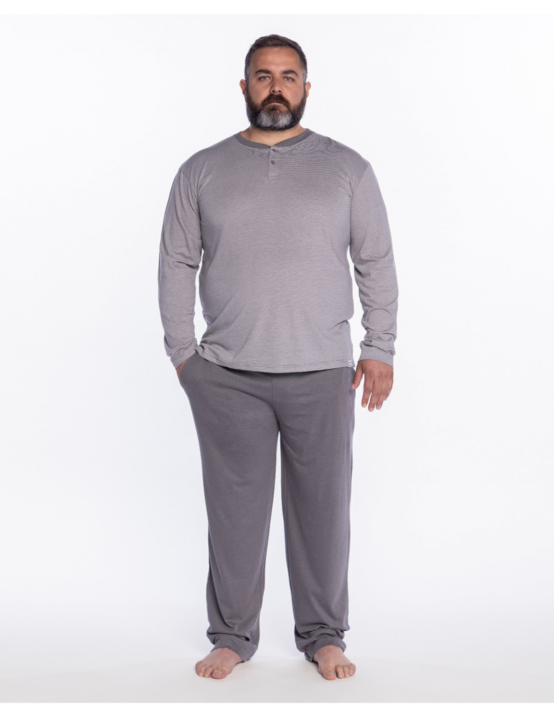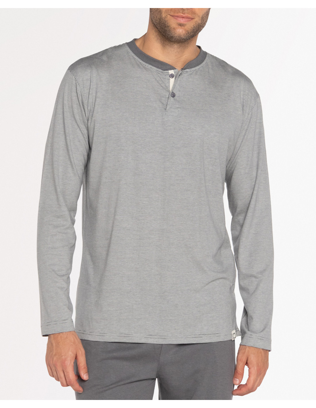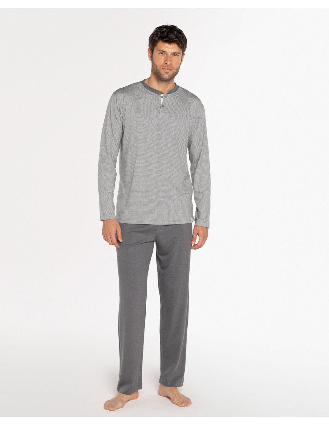 La camiseta de manga larga cuenta con cuello panadero con botones y presenta un delicado diseño de rayas horizontales en color gris claro, aportando un estilo moderno y relajado. El pantalón largo, confeccionado en el mismo tejido, se presenta en color gris claro, creando un conjunto equilibrado y muy cómodo.