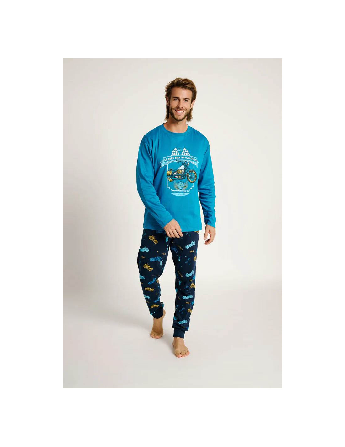 La camiseta de manga larga, con cuello redondo, presenta un moderno estampado de motos sobre fondo azul. El pantalón largo, en color negro con el mismo diseño de motos, incluye bolsillos laterales, cinturilla elástica con cordón ajustable y puños en los tobillos para un ajuste cómodo y funcional.
