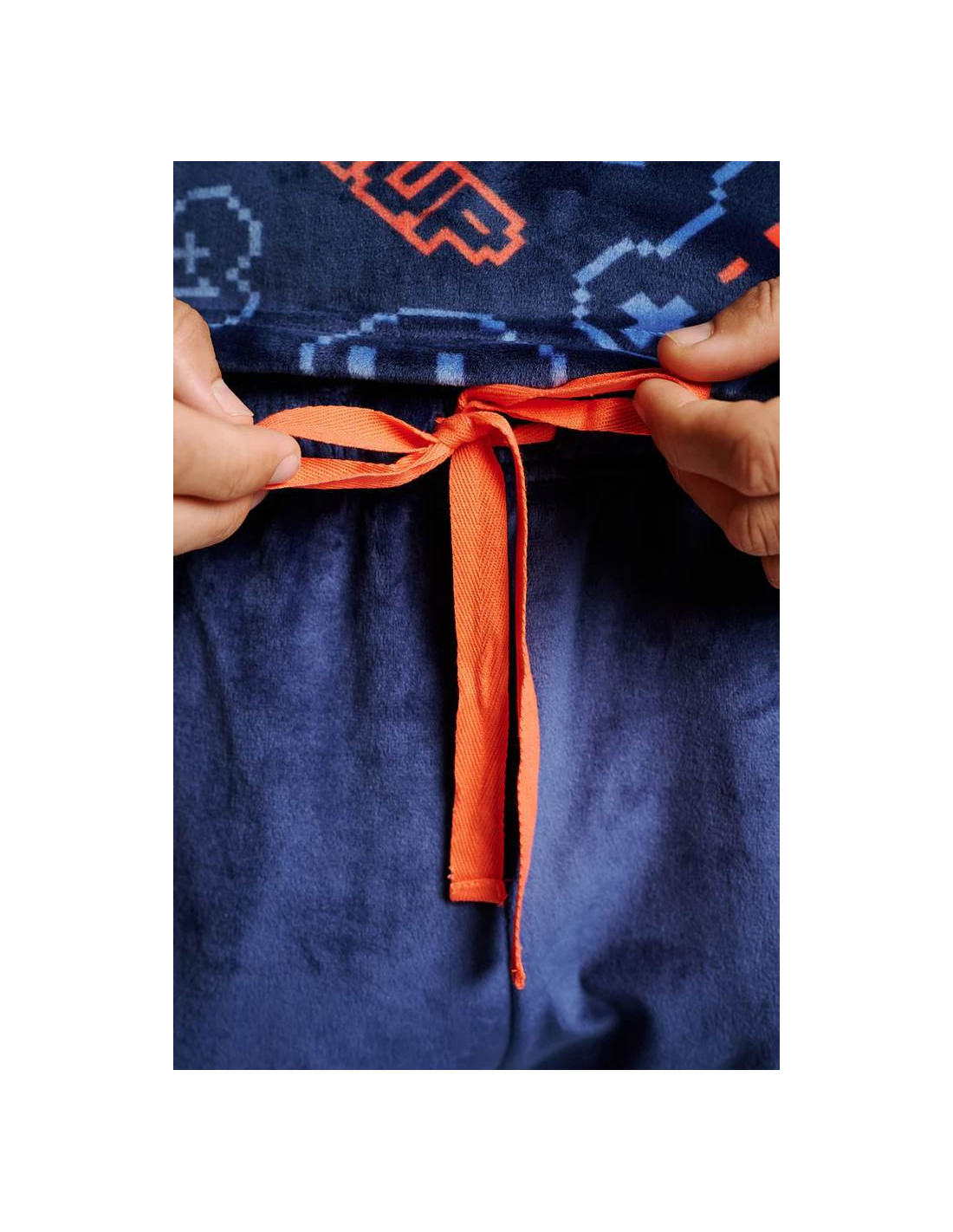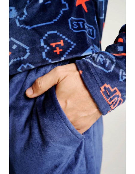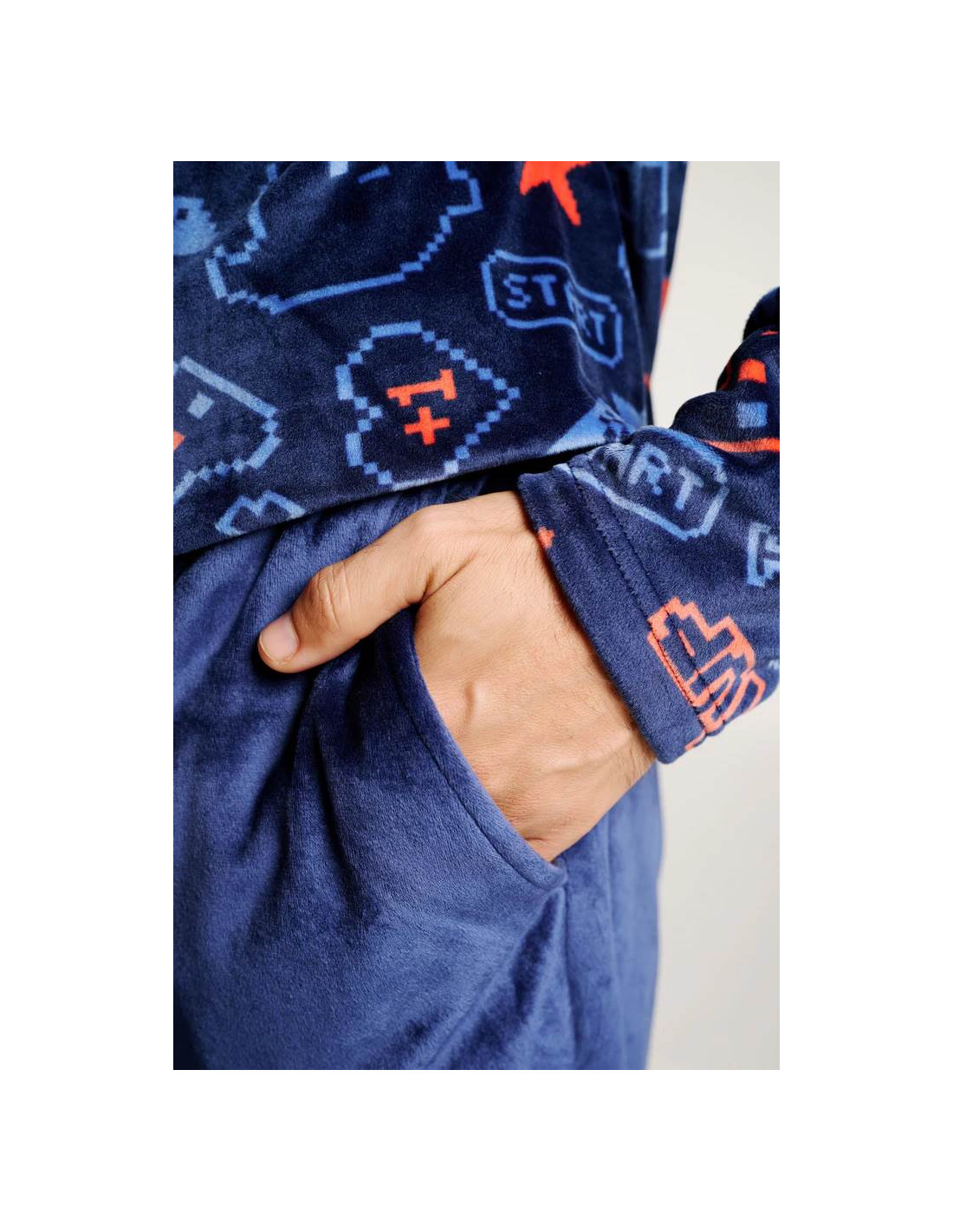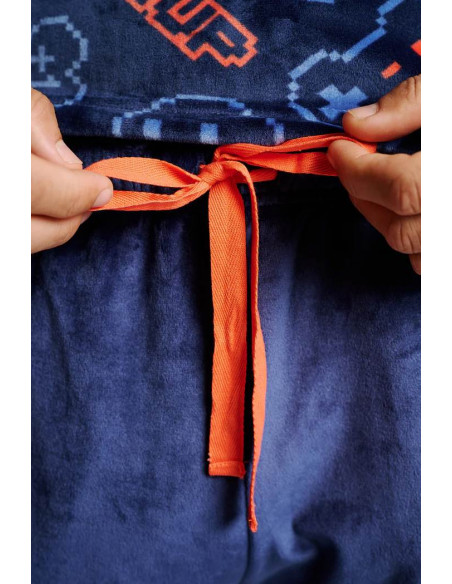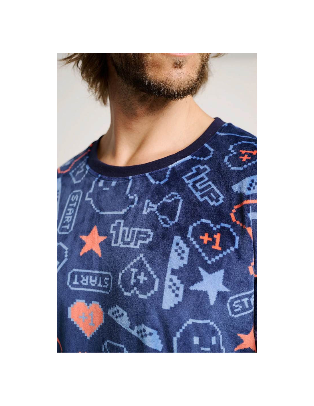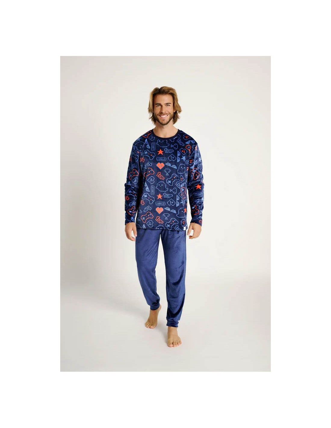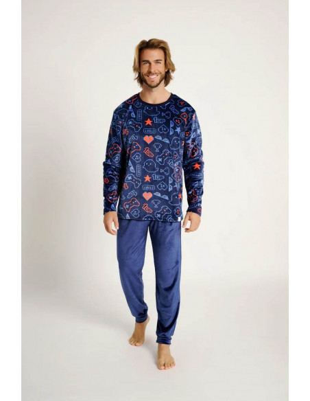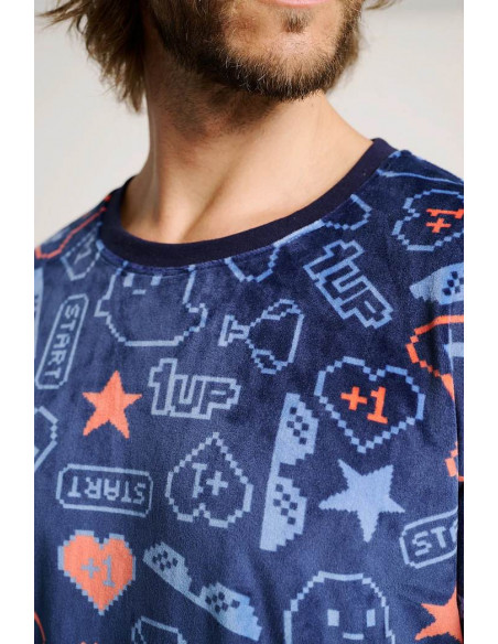Confeccionado en tejido microvelour, muy suave y calentito, es perfecto para las noches más frescas. La camiseta de manga larga con cuello redondo presenta un original estampado de elementos del mundo gamer sobre fondo azul oscuro, mientras que el pantalón largo en azul marino completa el conjunto con un ajuste cómodo y práctico.