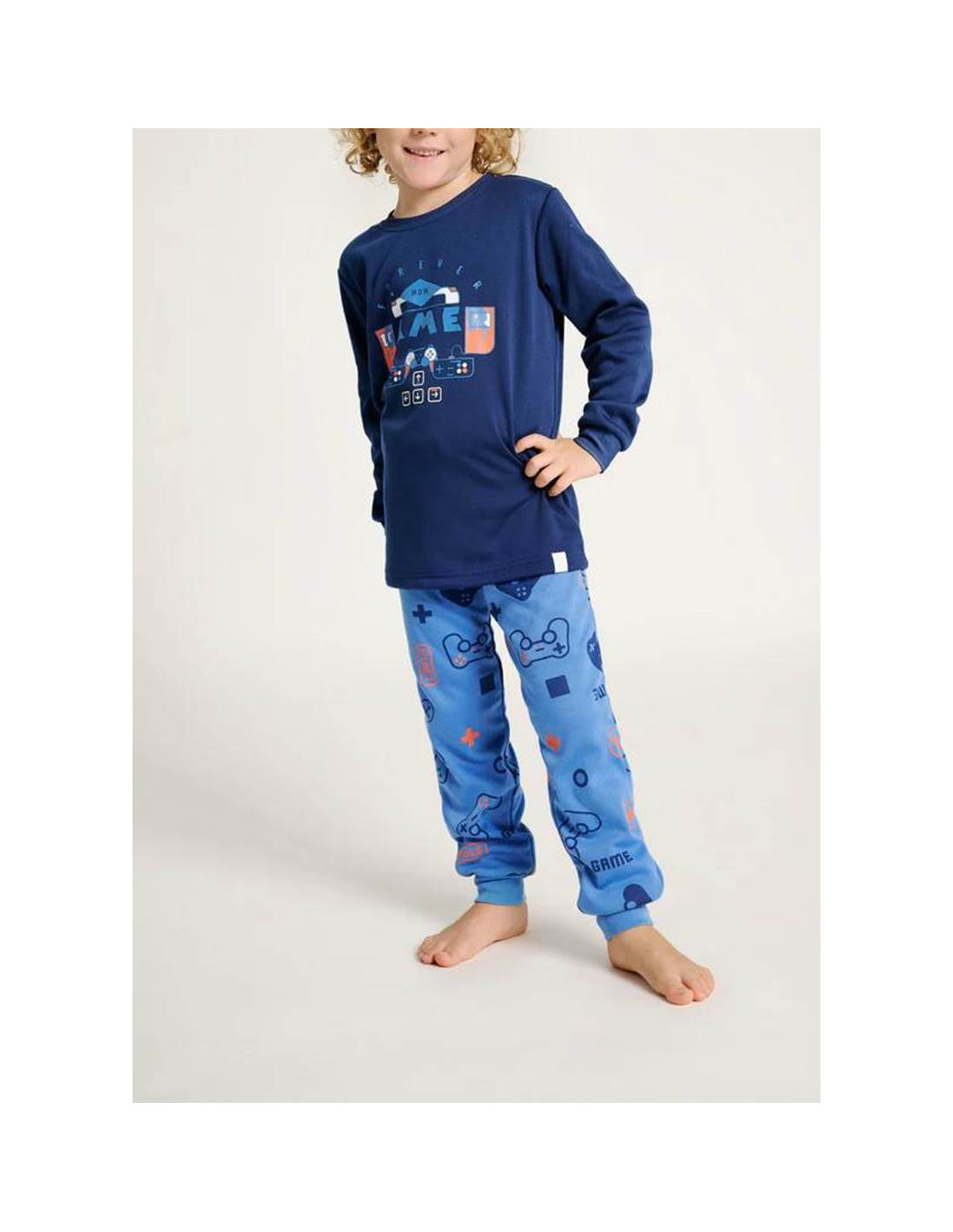La camiseta de manga larga y cuello redondo está confeccionada en un tejido tundosado muy suave, con un original estampado gamer sobre fondo azul marino. El pantalón largo a juego cuenta con cintura elástica y puños ajustados para un ajuste perfecto y mayor comodidad durante el descanso.