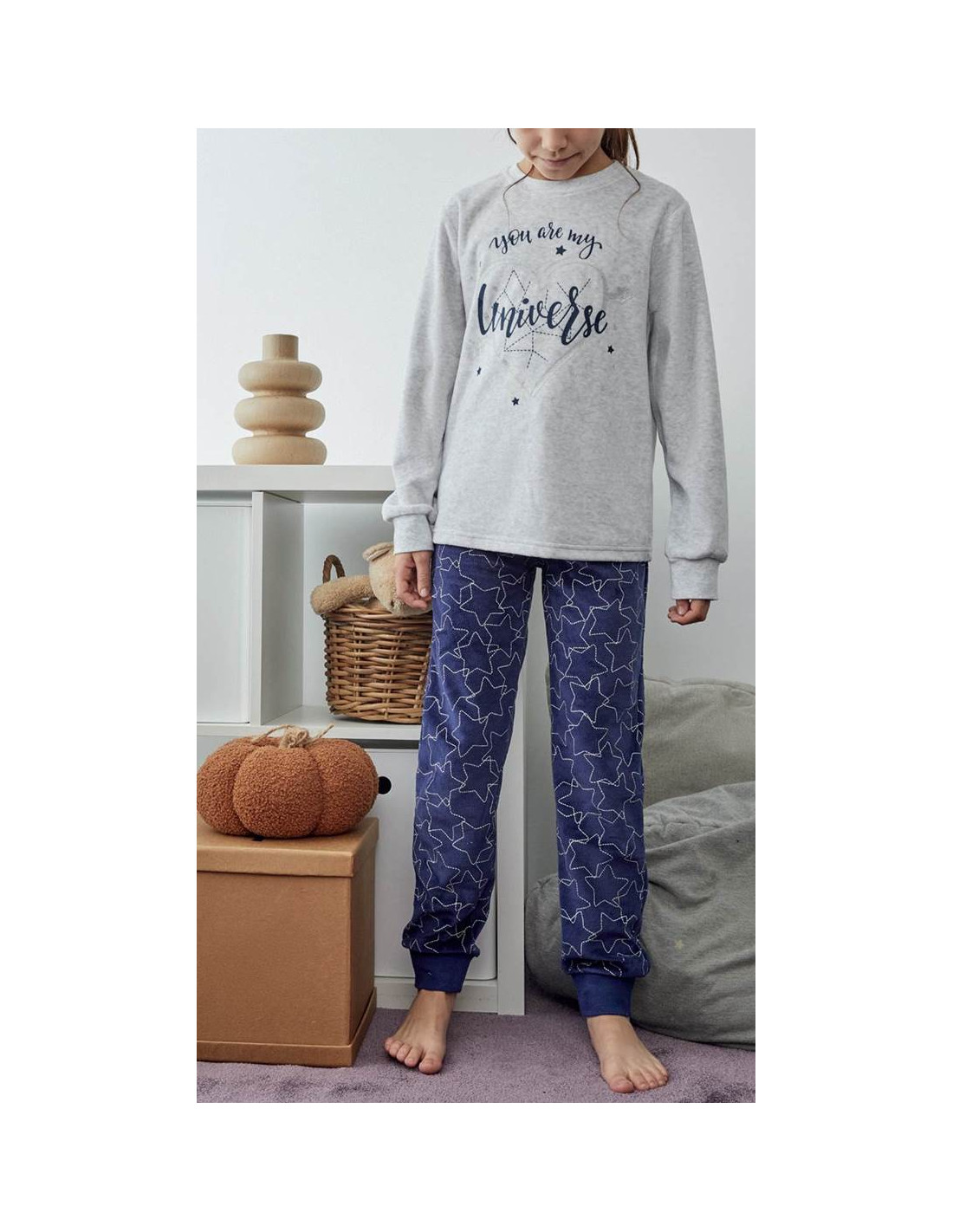 El pantalón largo, confeccionado en el mismo tejido, luce un estampado de estrellas sobre fondo azul marino, combinando a la perfección con la parte superior para un look acogedor y moderno.