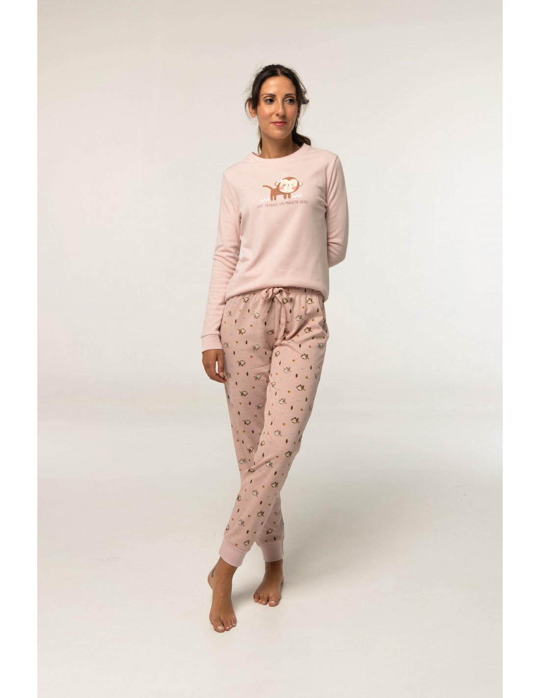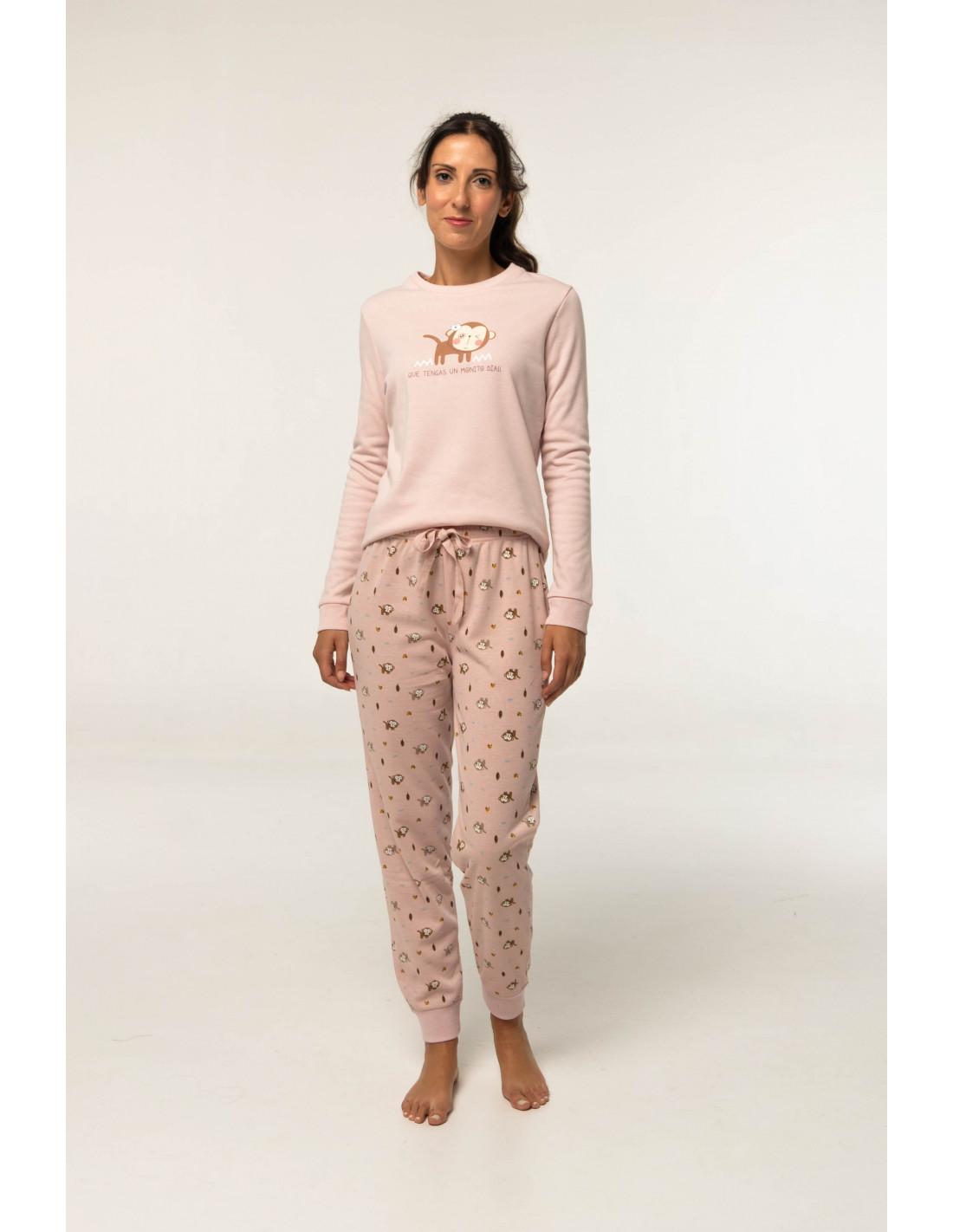 La camiseta, de manga larga y cuello redondo, está confeccionada en suave algodón con interior afelpado, lo que aporta una sensación acogedora ideal para los días más fríos. Su estampado con un mono sobre fondo liso y con mensaje "que tengas un monito día" añade un toque tierno y divertido sin renunciar a la sencillez y comodidad que buscas en un buen pijama.