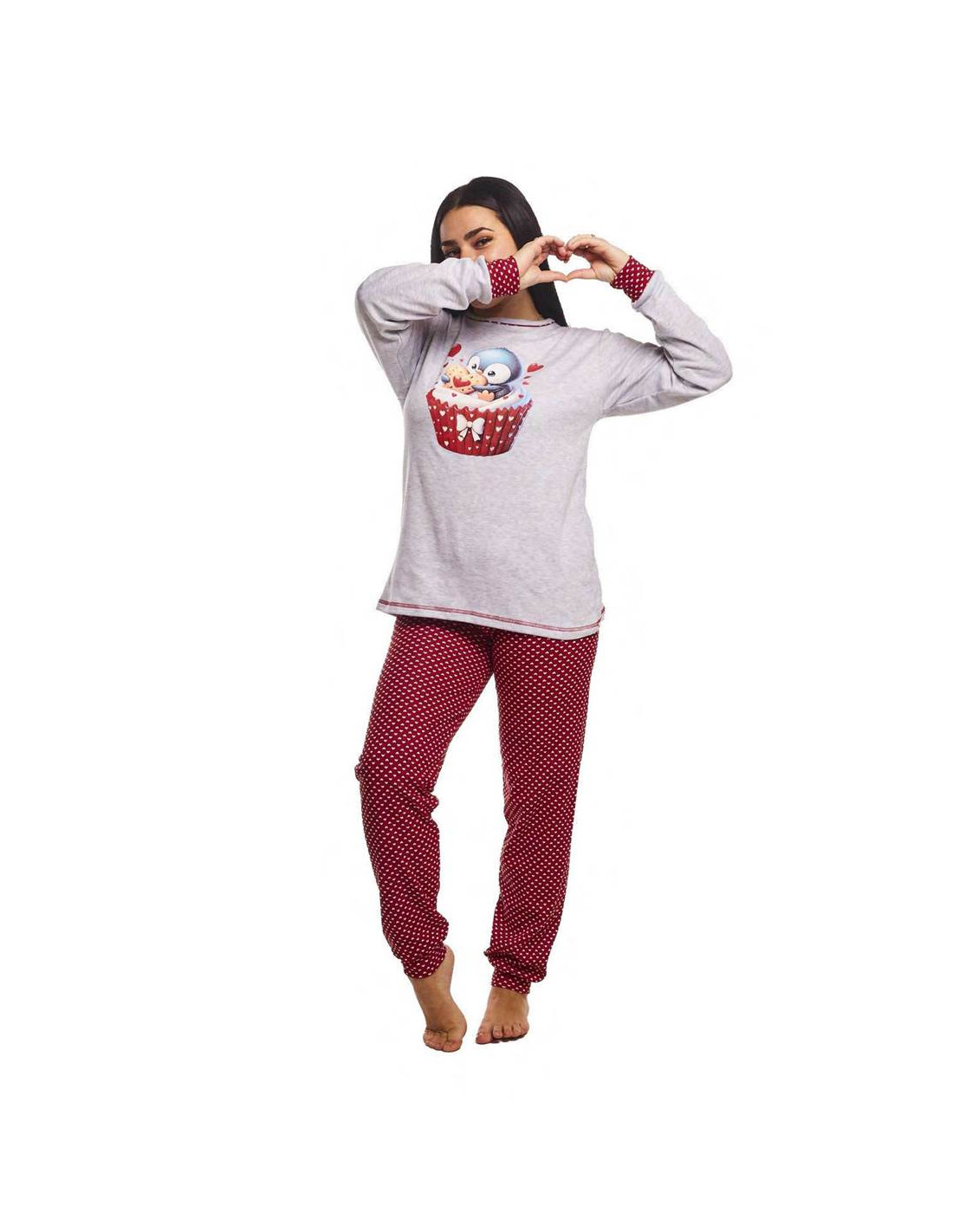La camiseta de manga larga y cuello redondo incorpora puños en las mangas para un mejor ajuste. Presenta un diseño en color gris con un simpático estampado de un pingüino dentro de un cupcake, que aporta un estilo original y desenfadado. El pantalón largo, elaborado en el mismo tejido cálido, cuenta con puño en el bajo y un atractivo color rojo con estampado de corazones, creando un conjunto armonioso y cómodo.