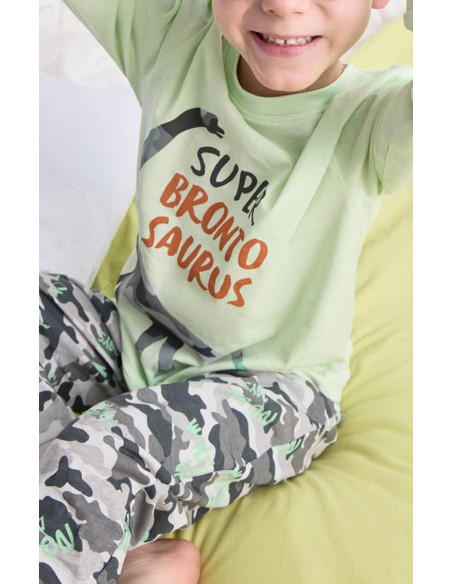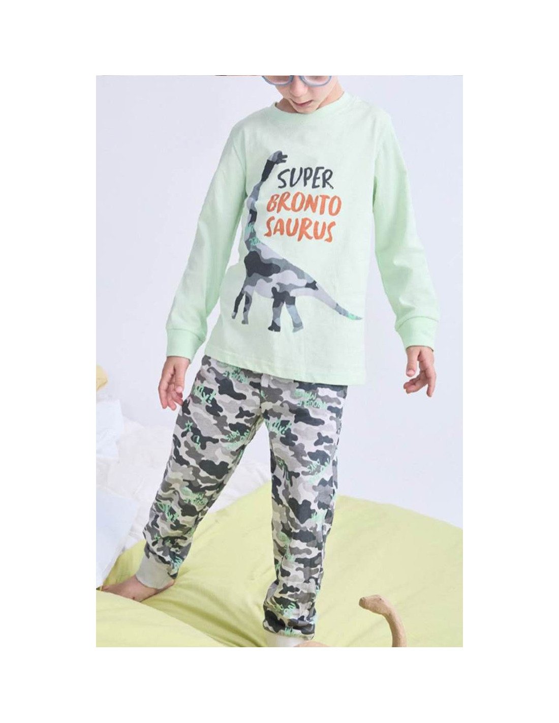 La camiseta de manga larga cuenta con cuello redondo y presenta un diseño estampado de dinosaurios sobre fondo verde, aportando un estilo moderno y desenfadado. El pantalón largo, con un diseño estampado de camuflaje, está confeccionado en el mismo tejido e incorpora cintura ajustable para un mejor ajuste, además de puños en los tobillos que garantizan comodidad durante toda la noche.