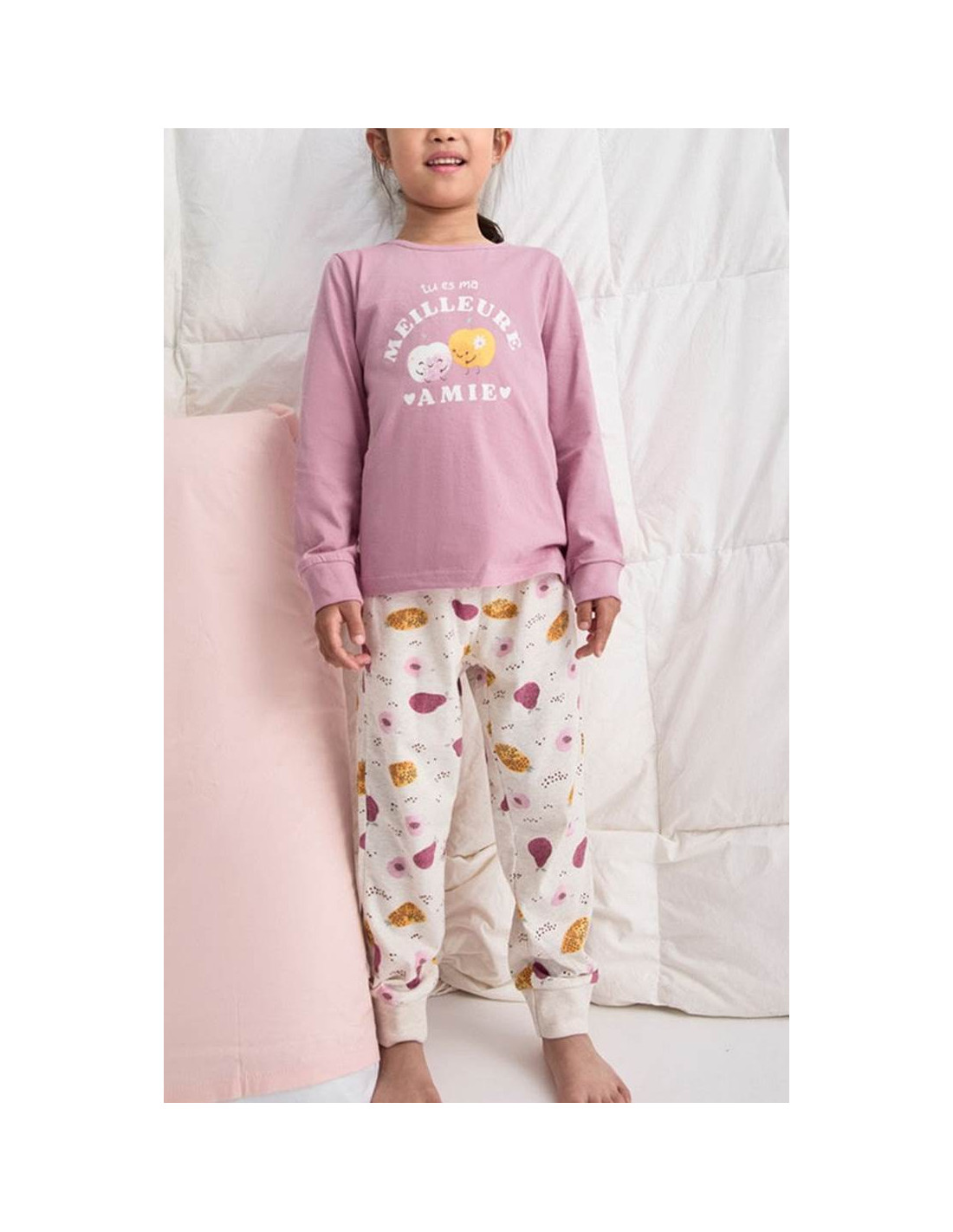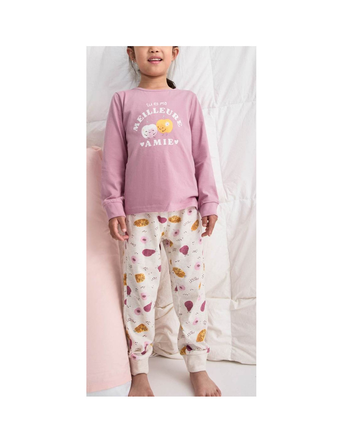 La camiseta de manga larga cuenta con cuello redondo y puños en las mangas, e incorpora un encantador diseño estampado de manzanas en tonos rosas que aporta un aire dulce y femenino. El pantalón largo a juego, también con el mismo estampado, incluye cintura elástica y puños en los tobillos, garantizando un ajuste cómodo y seguro durante toda la noche.