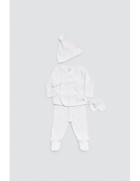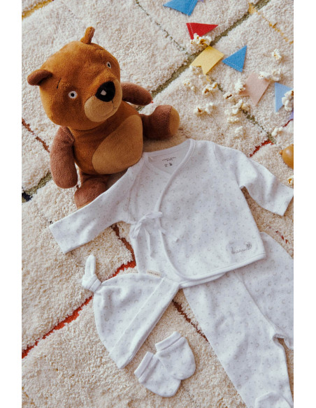 El set incluye 4 piezas esenciales para la primera puesta del bebé: