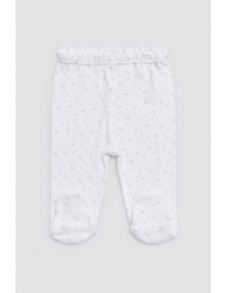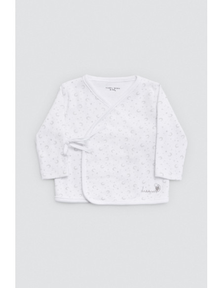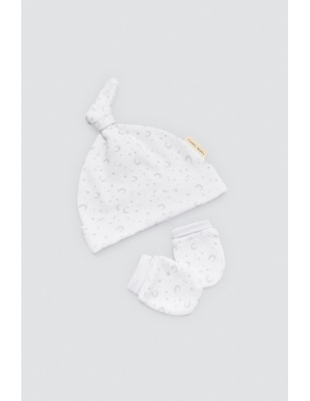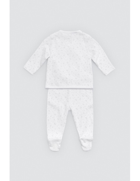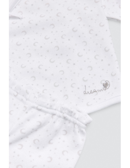Su color blanco neutro y el delicado diseño de lunas lo convierten en un conjunto elegante y atemporal, perfecto tanto para niño como para niña.