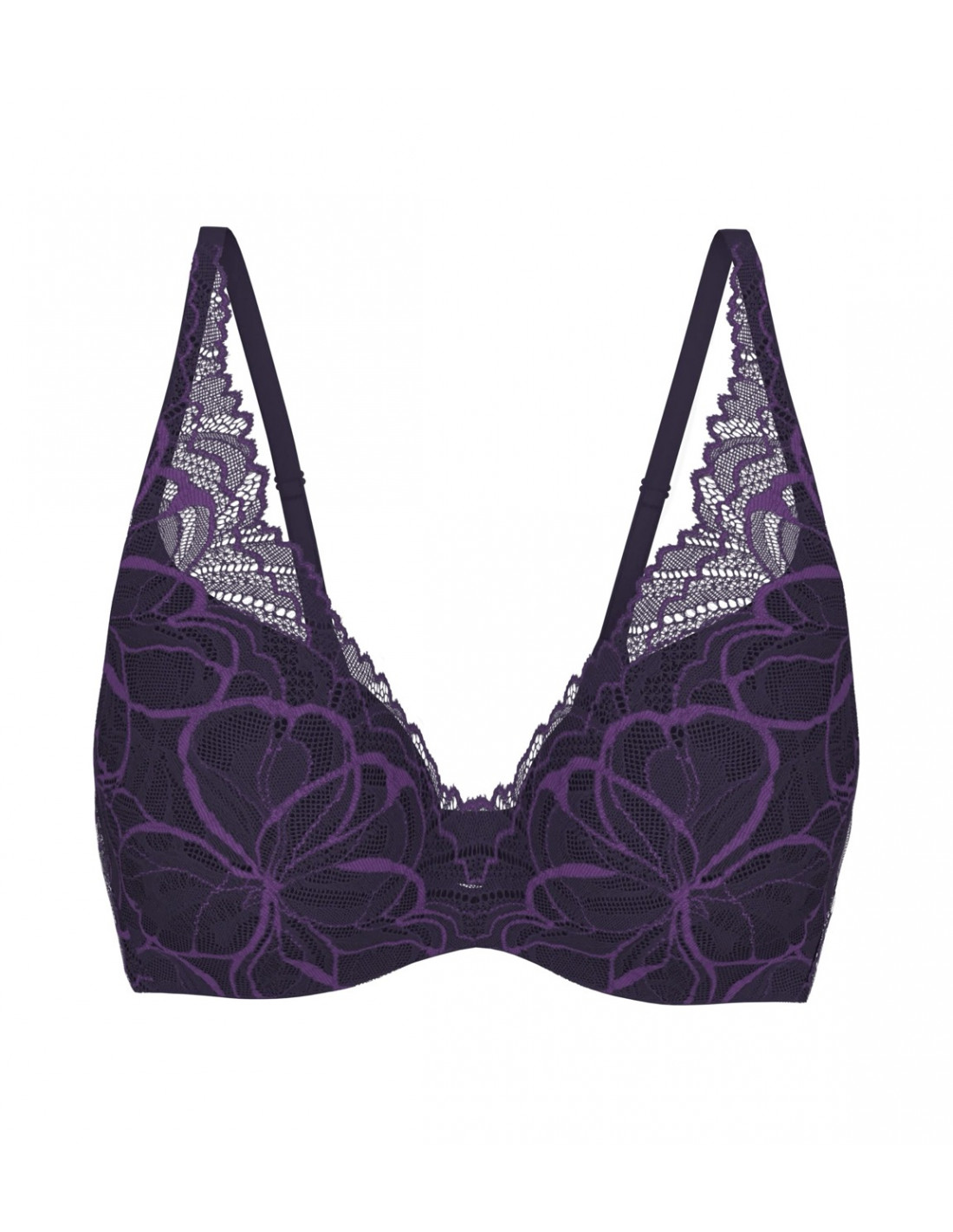 Con un diseño de escote profundo y encaje de lujo, este sujetador aporta un toque sofisticado y femenino. La forma cónica de su copa con relleno se ajusta perfectamente al pecho, logrando un efecto invisible bajo la ropa. Todo ello confeccionado en microfibra ultrasuave, ideal para el uso diario.