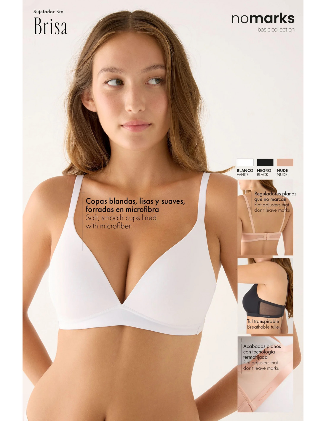 Dentro de la línea nomarks, el modelo Brisa representa una vida sin presiones y un diálogo de bienestar con tu cuerpo. Es un sujetador sin aros, con relleno de la copa B, que maximiza la comodidad sin perder la forma.