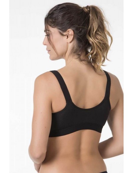 Confeccionado en algodón hipoalergénico, este sujetador no tiene aros ni copas preformadas, lo que garantiza una sensación suave y libre de presiones. Su cierre delantero con doble posición de corchetes facilita la colocación y el ajuste, especialmente en momentos de movilidad reducida. Además, cuenta con bolsillos en ambos lados para la colocación de prótesis, aportando mayor versatilidad y adaptabilidad.